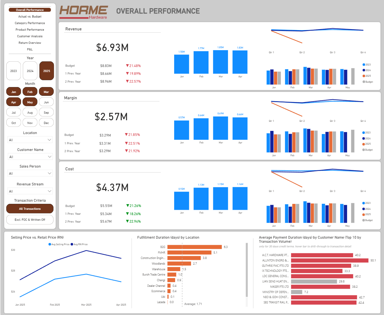 Power BI prototype for a hardware retailer that unifies sales and finance. Tracks Revenue, Margin%, and Cost with Actual vs Budget and YoY. Drill into top and bottom products and store locations, and review P&L in context. Built from staging warehouse with complex Power Query, robust modeling, and advanced DAX.