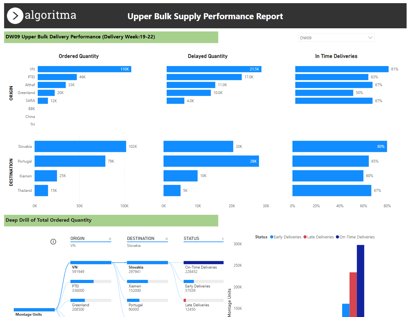 Prototype Power BI dashboard for ECCO to explore how delivery and distribution tracking could be managed in one page. Built with client-provided data, it highlights ordered vs delayed quantities, on-time delivery rates, and root causes of delays across origins and destinations.