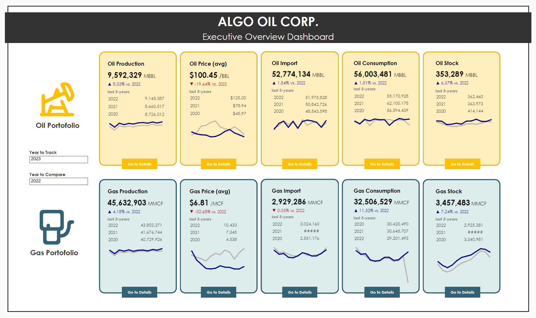 Tableau dashboard built for an oil & gas executive team using real data from the U.S. Energy Information Administration (EIA). It tracks production, imports, consumption, and stock performance with year-over-year and three-year trend comparisons.